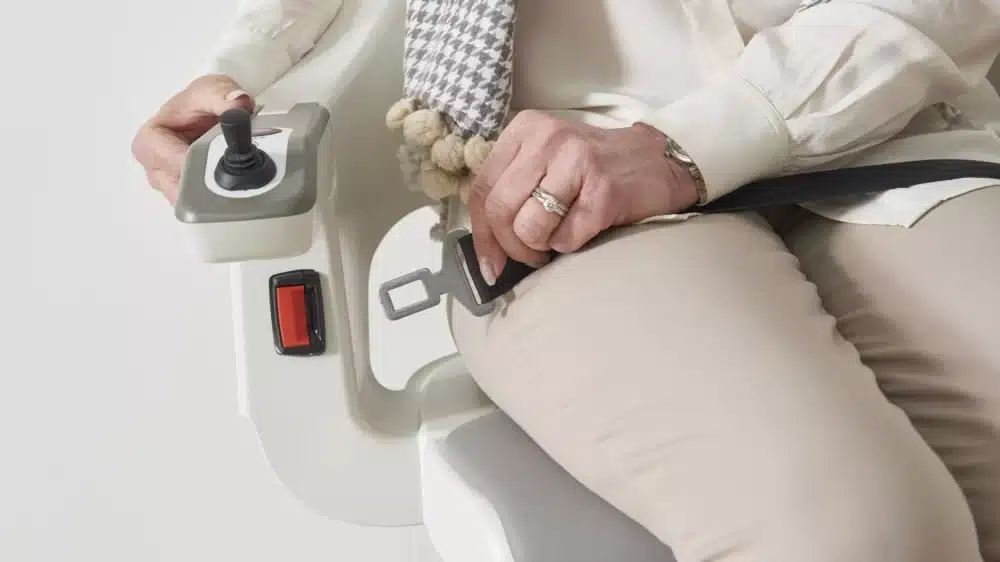 A retractable seatbelt keeps you secure while using your HomeGlide stairlift. The integrated sensor ensures the seatbelt is fastened securely before travel, and the stainless steel buckle is designed to be operated with just one hand.