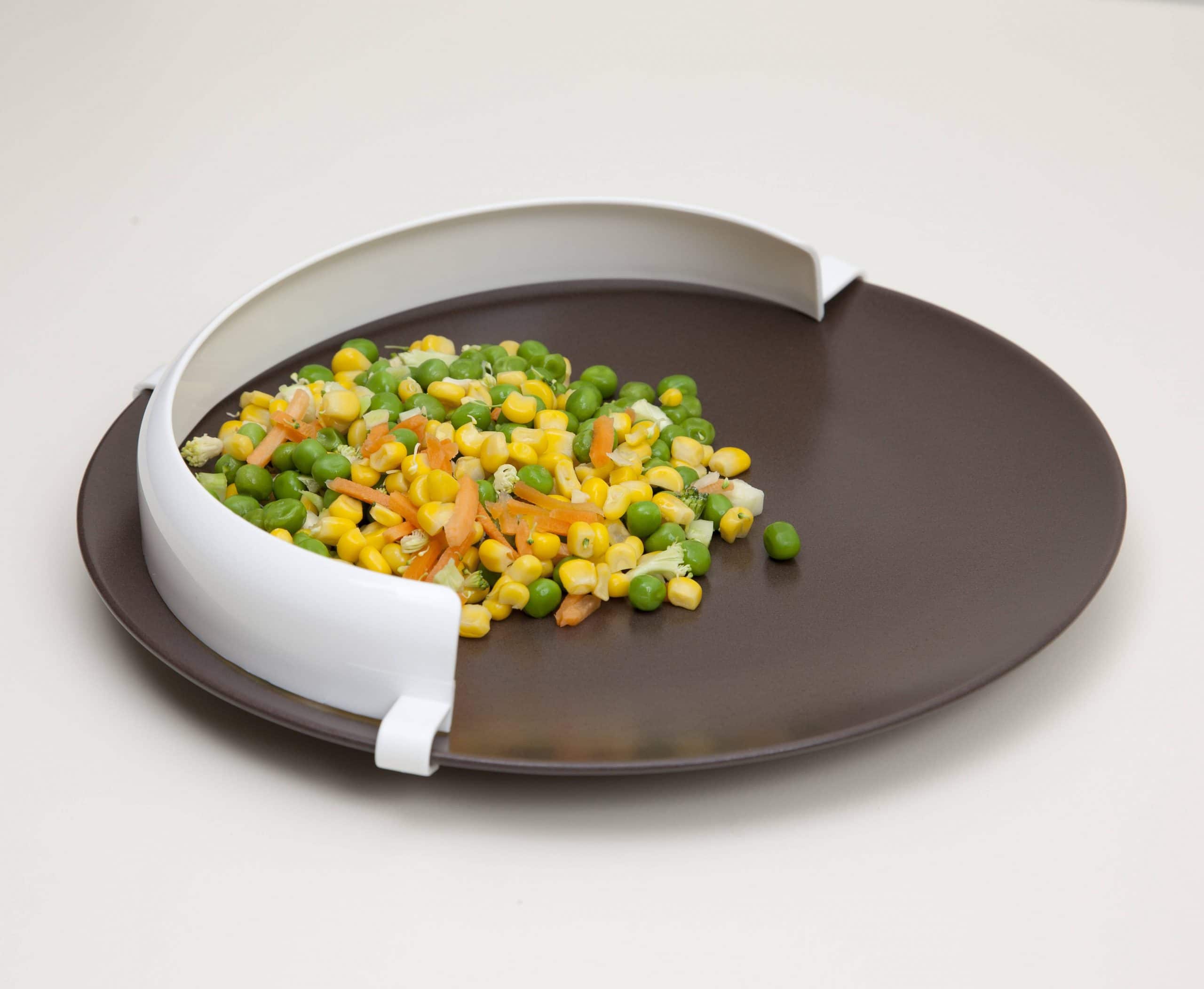 This plastic clip-on food guard can be easily fitted to a standard plate. Designed to prevent spillage and help in loading a fork or spoon, making it ideal for those who have limited to one-handed movement.