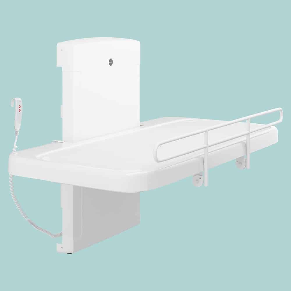 Pressalit’s SCT 2000 is a wall mounted shower change bench, available as fixed height or with electric height adjustment. The 2000 series shower and changing tables has a low start position, to make transfers to the bench easier, and with washable coated canvas for easy cleaning. The flexibility of the shower and changing table provides for optimal working conditions for the carer as well as a high level of comfort and safety for the user.