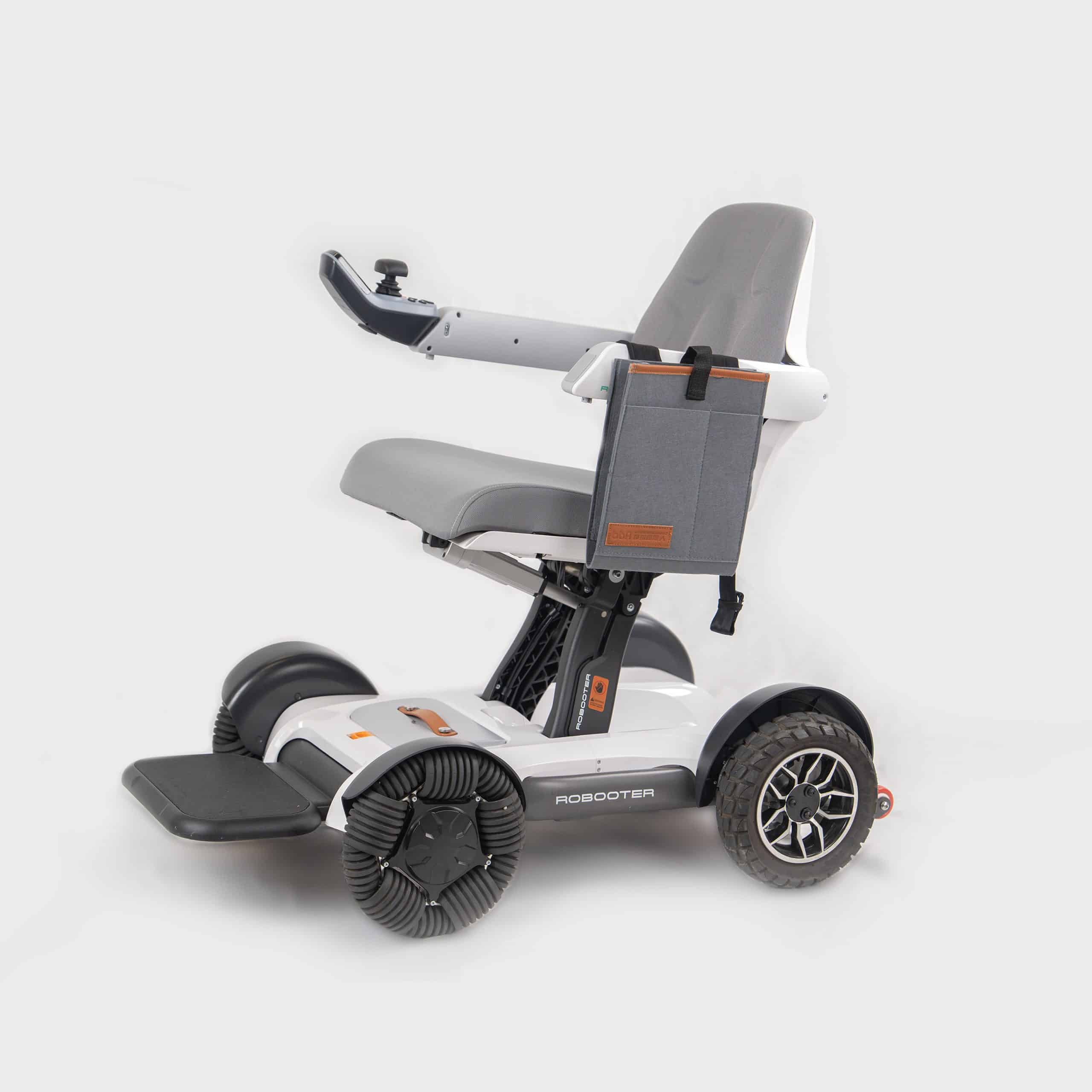 Practical felt storage bag which hangs on the armrest of the Robooter X40 electric wheelchair.