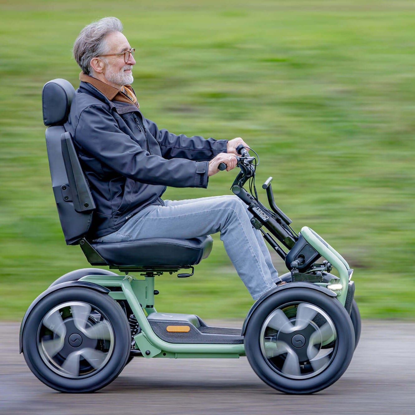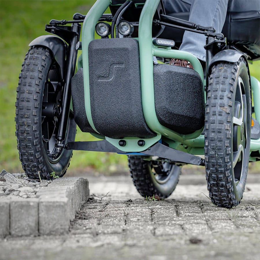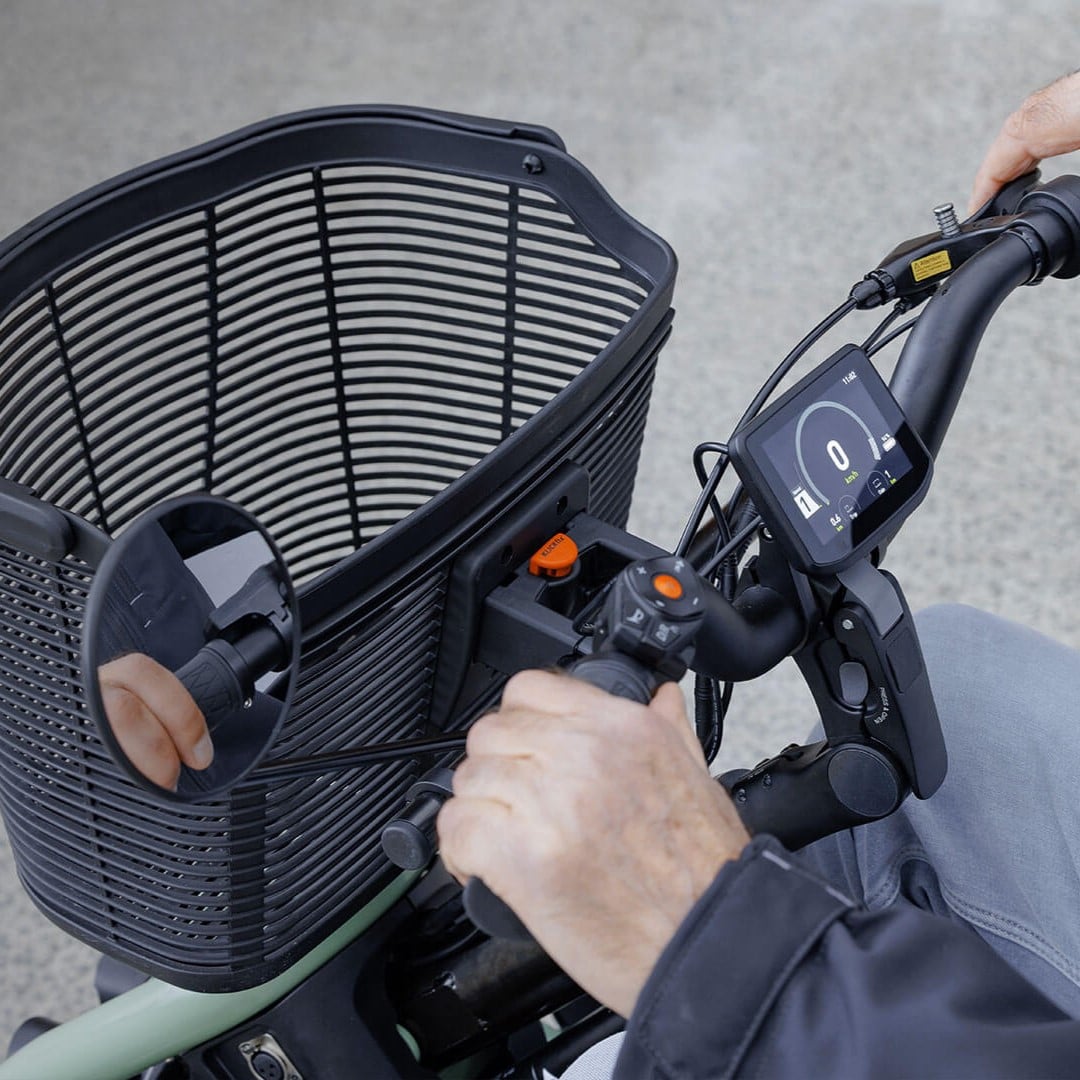 The Sterling S800 by Scoozy effortlessly transitions you from biking to a mobility scooter, with fimiliar bike-style handlebar controls, 4 large wheels, advanced suspension, and a lithium battery. Engineered for stability and comfort on both urban streets and nature trails, the S800 delivers a modern and cool mobility solution.